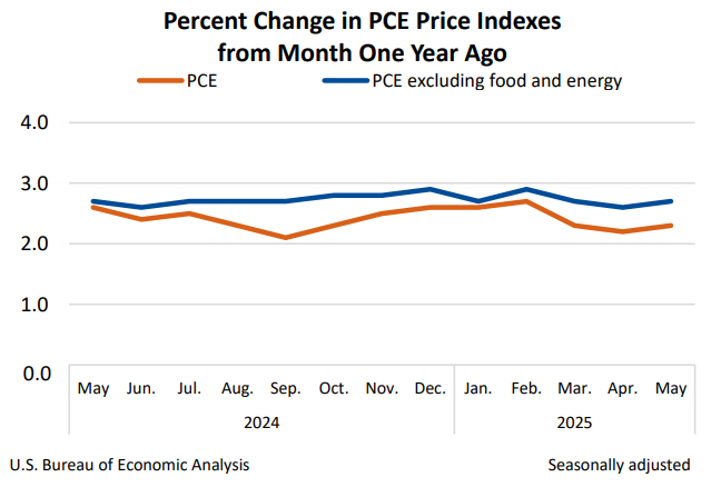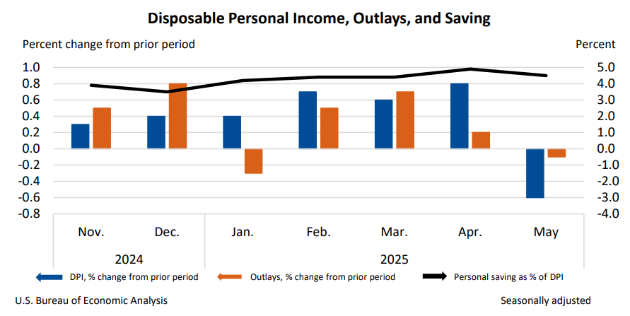 总的来看,周五数据显示,美国5月消费者支出意外下降,通胀温和上升。提前购物的热潮消失后,消费者支出上季度几近停滞。服务支出同步减少,导致消费支出季率仅增0.5%,创2020年二季度以来最低。该数据预示二季度消费增长路径疲软。消费疲软叠加通胀温和的局面,仍不足以促使美联储7月重启降息。经济学家指出,当前通胀温和源于企业仍在销售关税生效前囤积的库存,预计通胀将从6月CPI数据开始抬头。