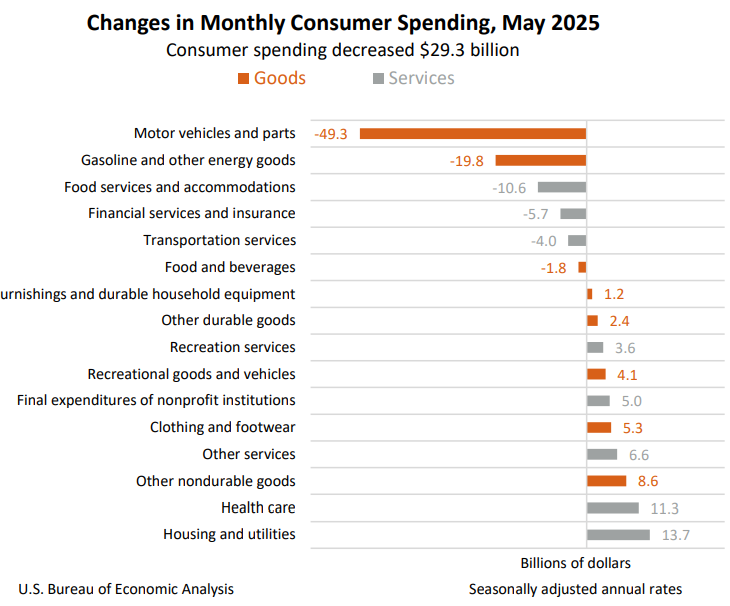 5 月份家庭消费需求低迷,这与疫情爆发以来消费者支出表现最差的一个季度相吻合——这种消费放缓态势有可能会蔓延至就业增长的放缓。汽车购买支出下降了6%,这扭转了3月和4月消费者为赶在关税生效前购买车辆而出现的激增态势。